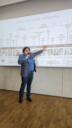 | Prof. Dr. Peter Roth erläutert die Entstehungsgeschichte der künstlichen Intelligenz | Alicia Pichlmeier gewann den Preis für Nachwuchswissenschaftler, v.l. Dr. Johanna Bausch, Alicia Pichlmeier, Dr. Ulrike Sorge, Dr. Marco Horn | |